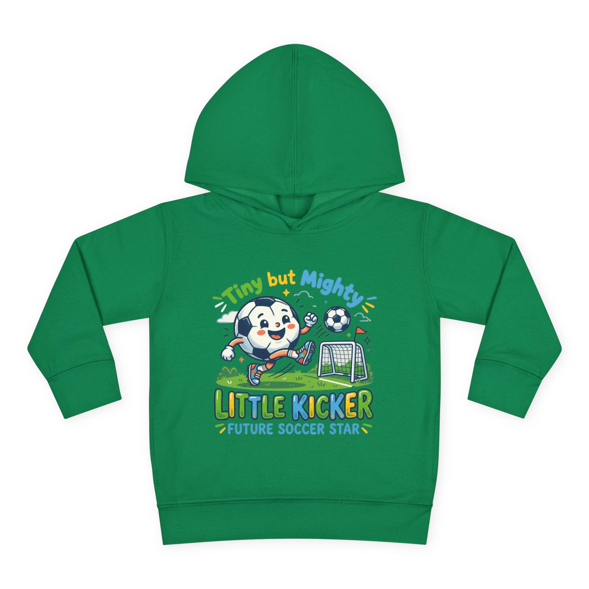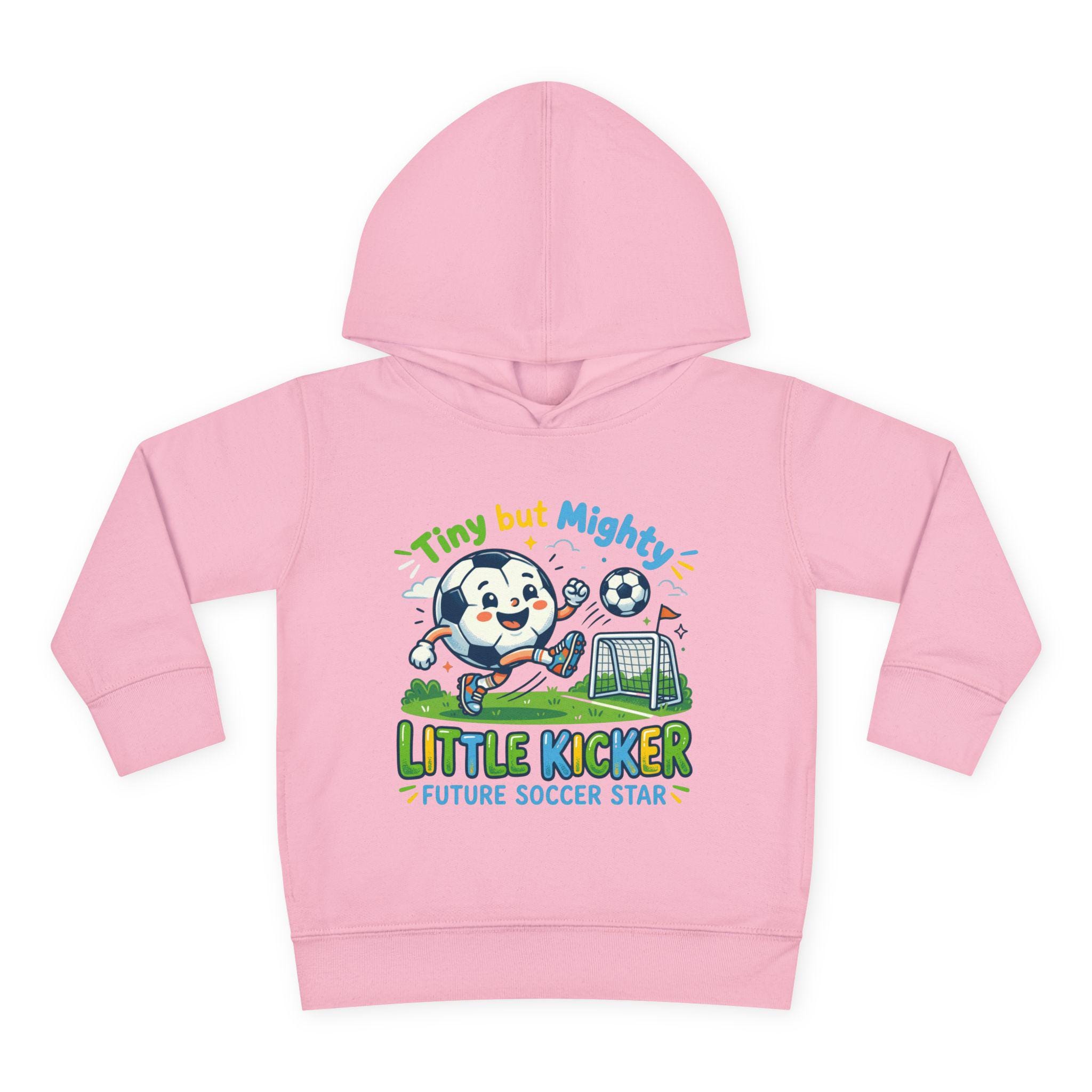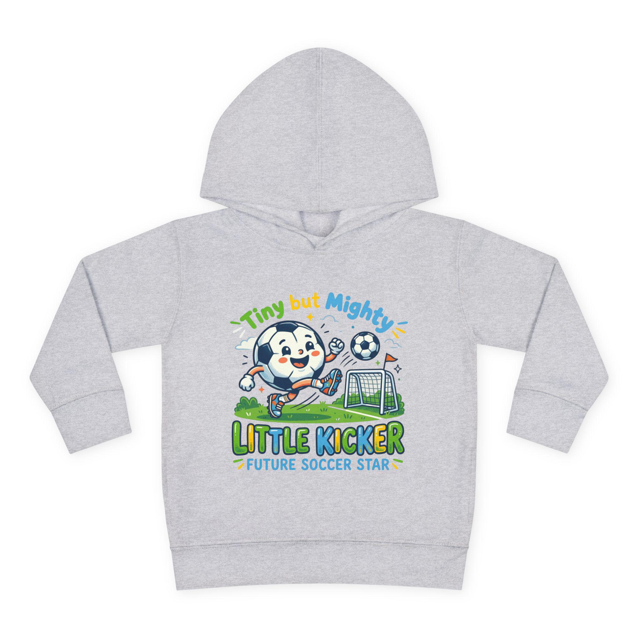 Soft, cozy hoodie made for little players who live for backyard goals and morning practice. The heather-gray pullover features a playful mascot charging a soccer ball toward a tiny net, with bright, kid-friendly lettering that reads “Little Kicker — Future Soccer Star.” Lightweight but warm, the fleece hood and jersey-lined hem keep energy up on chilly runs to practice, while roomy side pockets hold tiny treasures and scraped-knee bandages. It’s designed to move with active toddlers — stretchy ribbed cuffs and a resilient waistband keep the fit in place through tackles, tumbles, and touchdown dances.