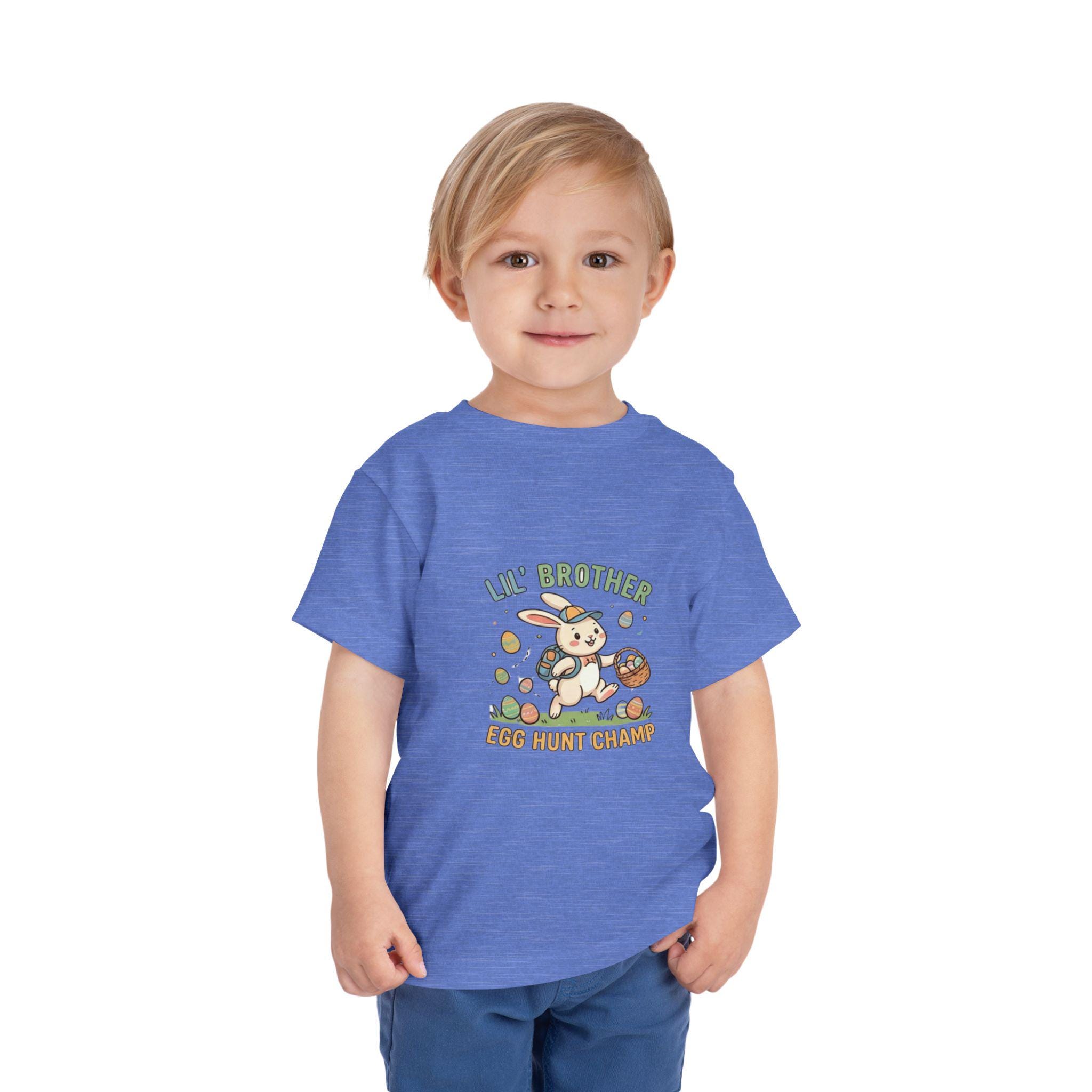 Soft, light, and playful — this toddler tee brings springtime mischief to little ones who love egg hunts and bunny buddies. The shirt features a sweet, vintage-style illustration of a hopping bunny with a tiny basket, scattered eggs, and warm, hand-drawn lettering that reads “Lil’ Brother Egg Hunt Champ.” The breathable airlume combed cotton feels gentle on sensitive skin, while the light fabric keeps active toddlers cool during play. Side seams give it a tidy shape that holds up to wriggly wear, and the tear-away label keeps necklines comfy. Whether it’s an Easter morning, a family photo, or everyday backyard play, this tee slips on easily and adds a cheerful, whimsical touch to little outfits.