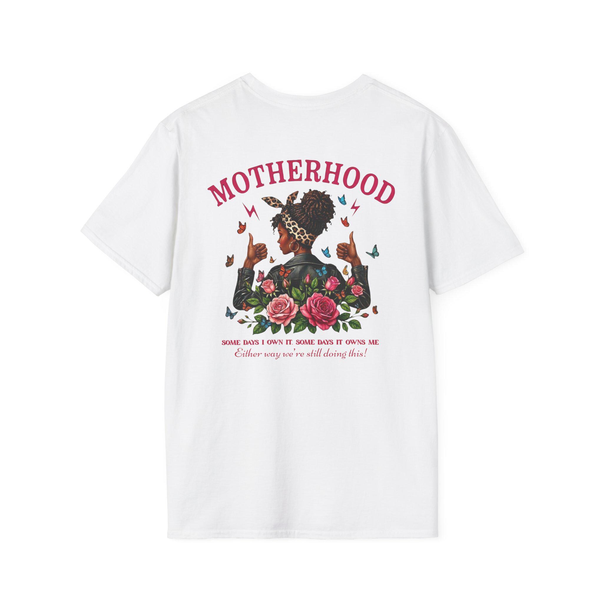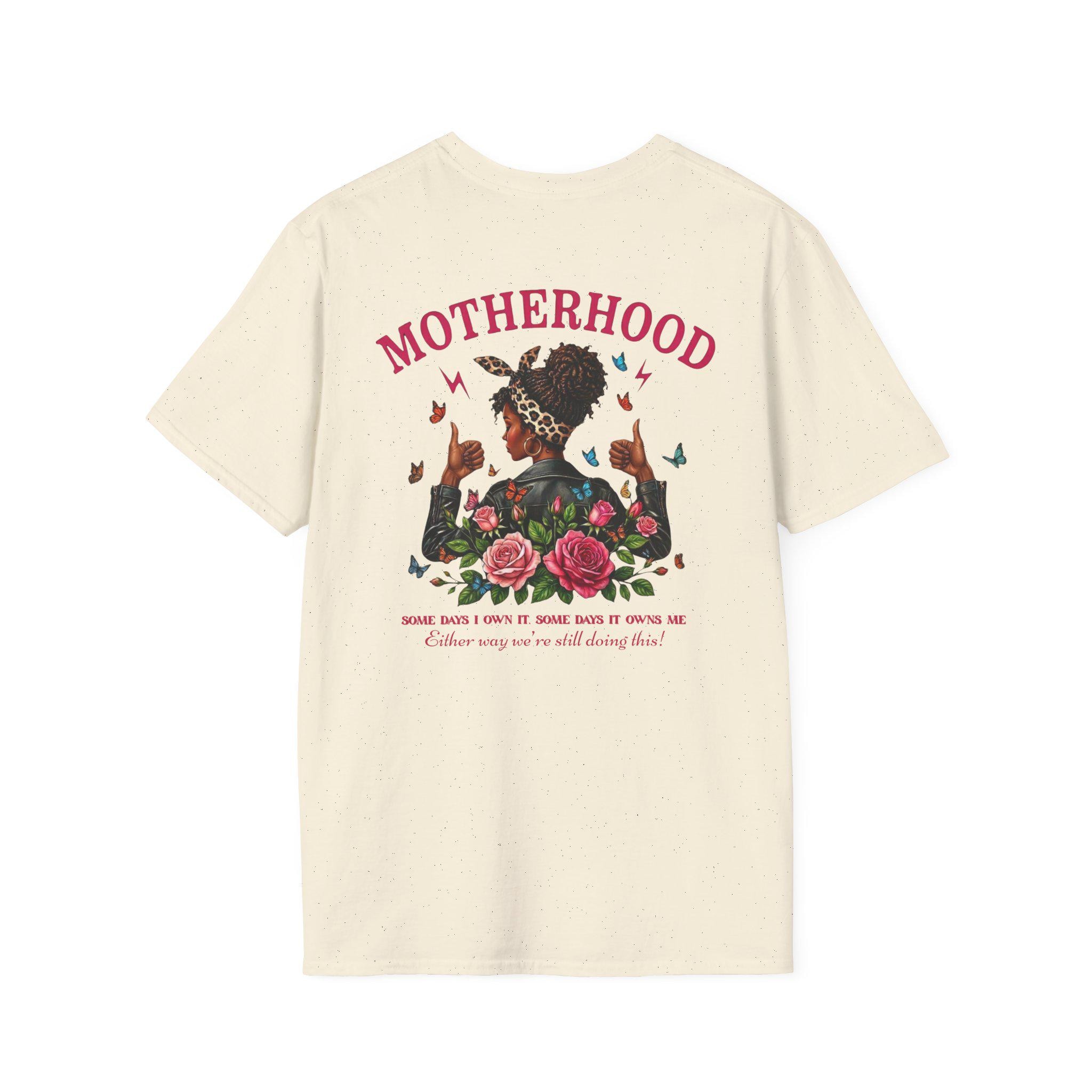 A soft, breathable tee that quietly celebrates the strength and warmth of motherhood. Lightweight ring-spun cotton drapes comfortably while the tubular knit and shoulder tape keep the fit smooth and stable after many wears. The front features a small, punchy “MOM” logo over the heart; the back shows an expressive, artful illustration of a mother surrounded by roses and fluttering butterflies with the headline “MOTHERHOOD.” Wear it to morning school runs, backyard cookouts, or slow afternoons with a book — it feels lived-in from the first wear and stays looking fresh through washes. Ethically sourced cotton, tear-away label for comfort, and durable print methods make this tee both thoughtful and made-to-last.